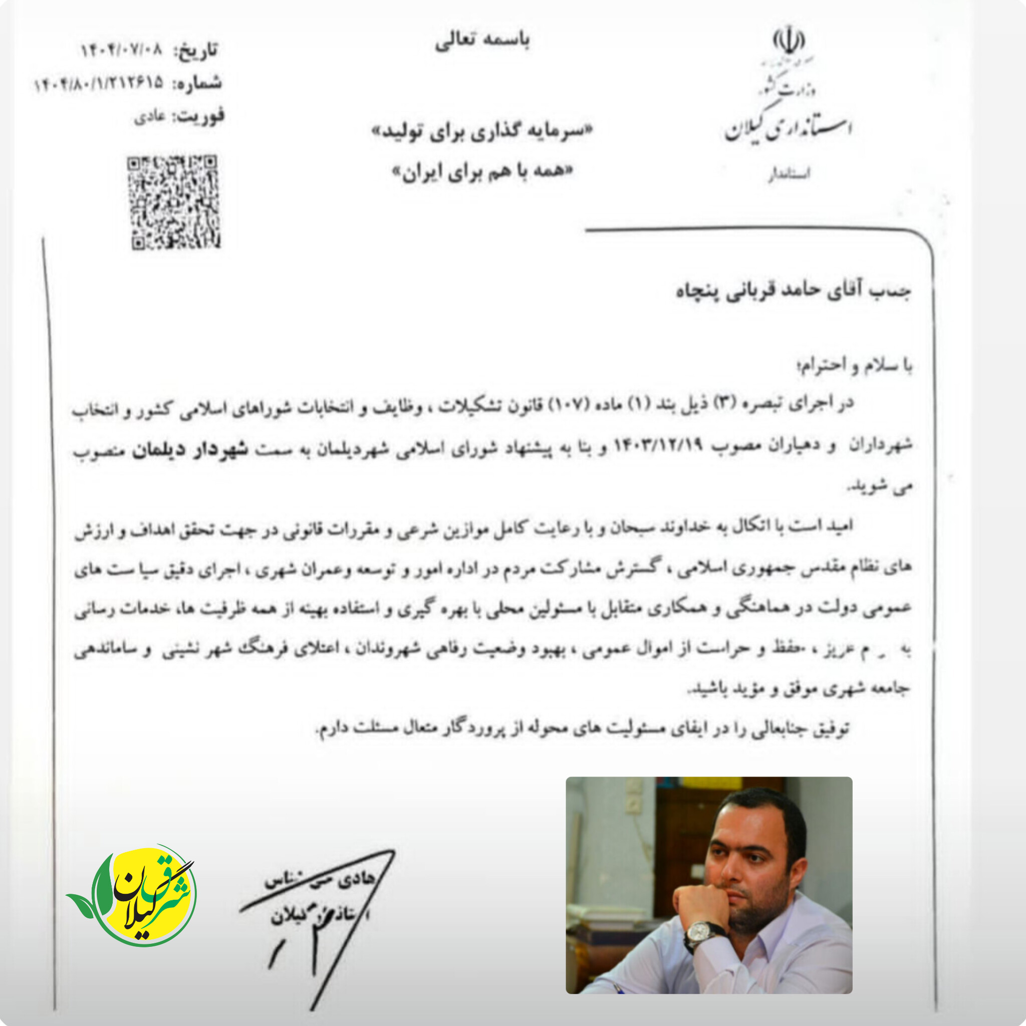 حامد قربانی با حکم استاندار گیلان رسما بعنوان شهردار شهر دیلمان منصوب شد.