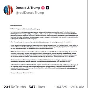 گفتنی است ترامپ بیانیه حماس را در صفحه شخصی خود منتشر کرد.